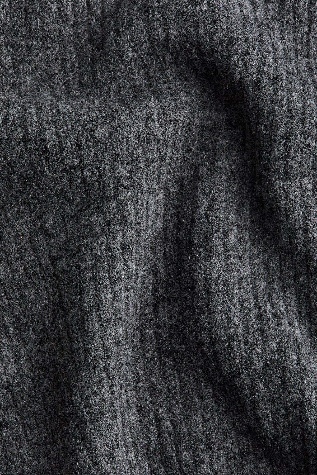 En tætsiddende trøje i blød, ribstrikket kvalitet med uafdækkede skuldre. Trøjen har en bred, foldet kant foroven, raglanærmer og en formstrikket sektion foran.